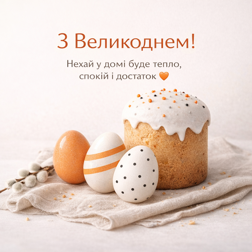Нехай Великдень принесе у ваше життя світлі думки, натхнення та віру в краще. Хай у серці панує мир, а кожен новий день відкриває можливості для добрих змін, розвитку та щасливих моментів.